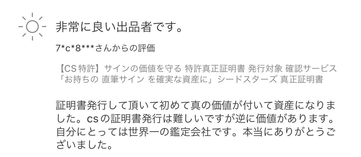 シードスターズ真正証明書は筆跡鑑定のみで証明書を発行するのではなく、 第三者にも証明できる証拠や証明を必要とするダブルチェック体制を採用しております。 いち鑑定機関の独断で証明書を発行できない今までに無い仕組みを導入することにより、不正を防ぎ、サイングッズの価値を確実に保護し、価値を高める事が可能になります。 【ご利用者様のお声の一例】