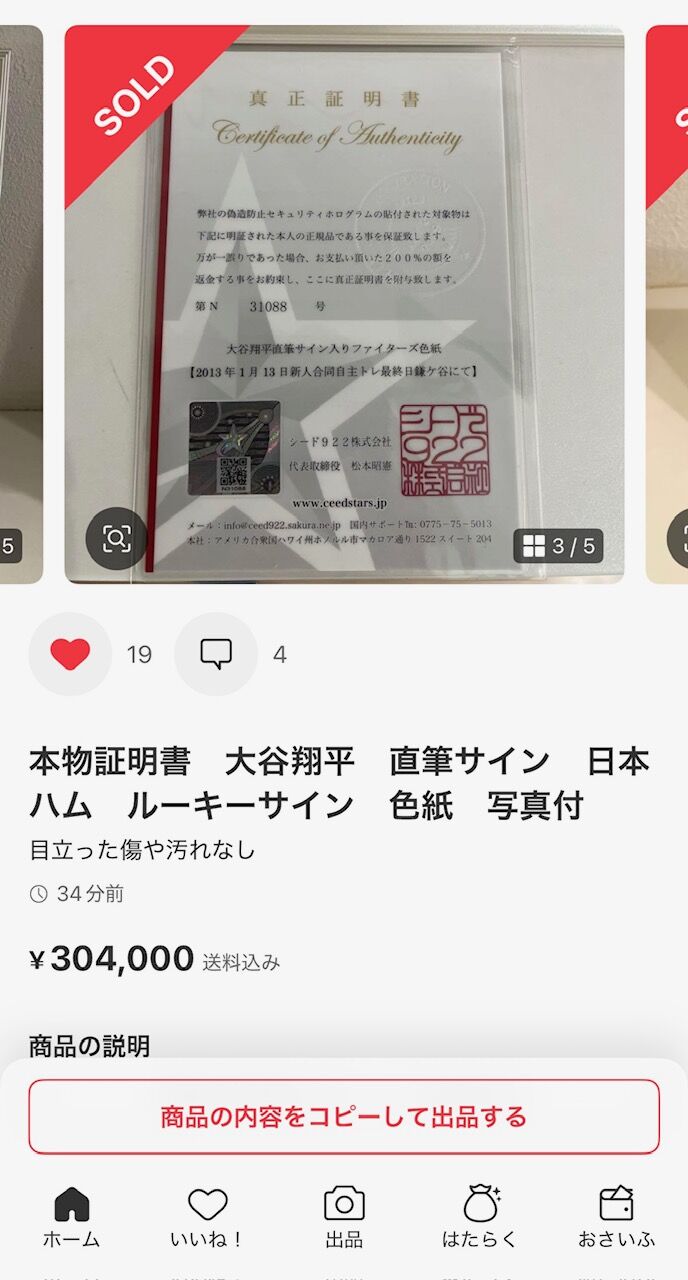 【大谷翔平選手サイングッズ真正証明書無し、真正証明書有りの例】